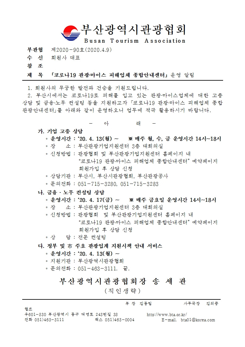 2. 부산시에서는 코로나19로 피해를 입고 있는 관광‧마이스업체에 대한 고충 상담 및 금융‧노무 컨설팅 등을 지원하고자 「코로나19 관광‧마이스 피해업체 종합관광안내센터」를 아래와 같이 운영하오니 업무에 적극 활용하시기 바랍니다.