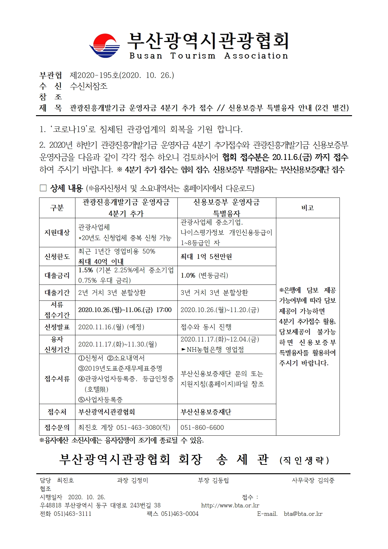 2020년도 관광진흥개발기금 운영자금 4분기 추가 접수를 안내 해드리오니 해당일자 까지 저희 협회로 신청하여 주시기 바랍니다.